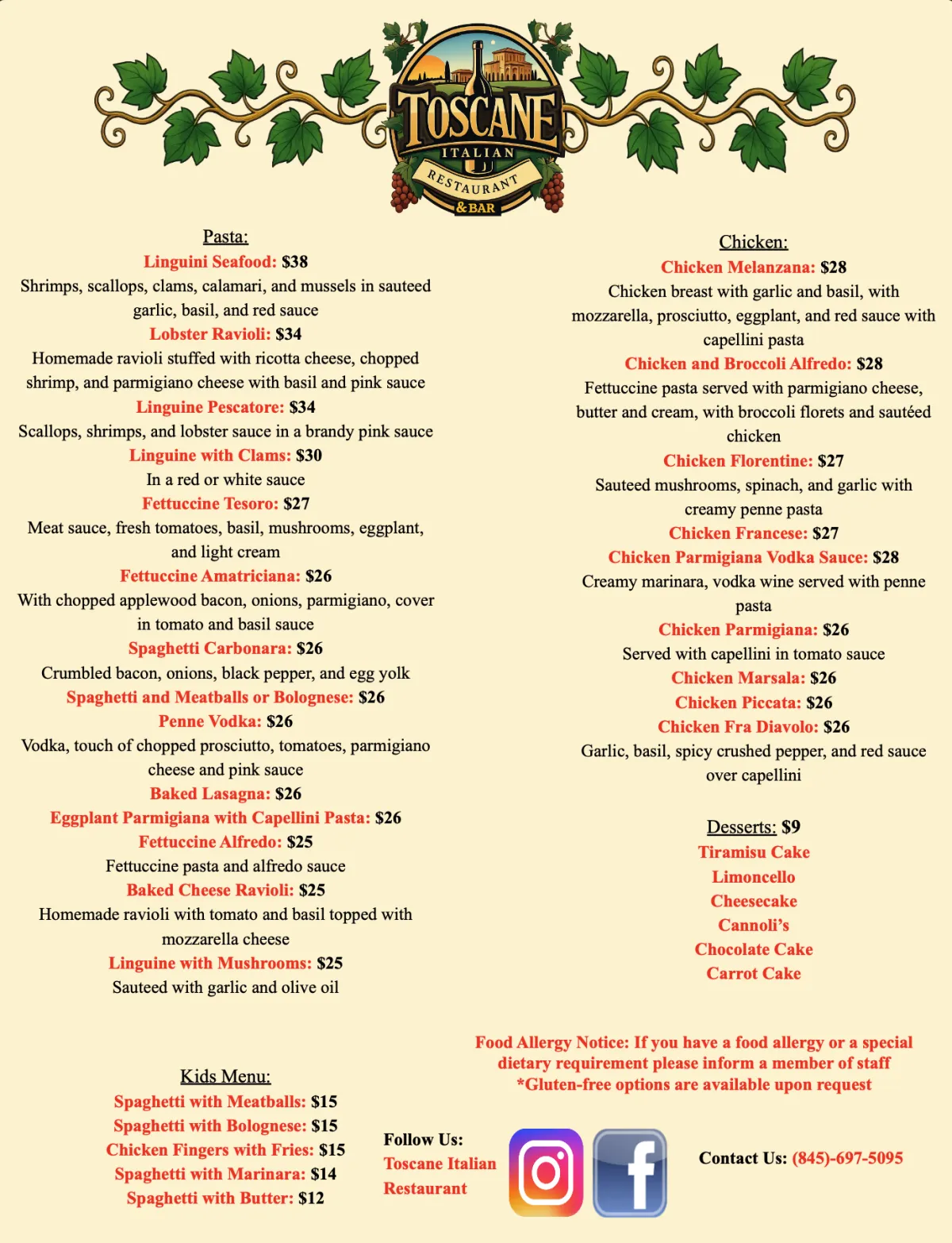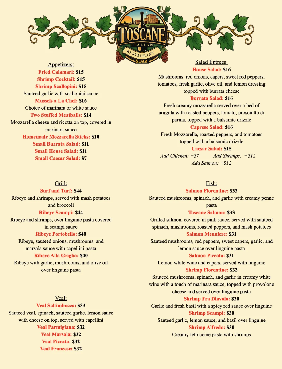 From classic pastas to hearty entrees and signature cocktails, every plate is crafted with care, quality ingredients, and a passion for authentic flavor. Founded with a love for timeless recipes and modern hospitality, Toscane is more than just a place to eat it’s a place to relax, connect, and indulge.